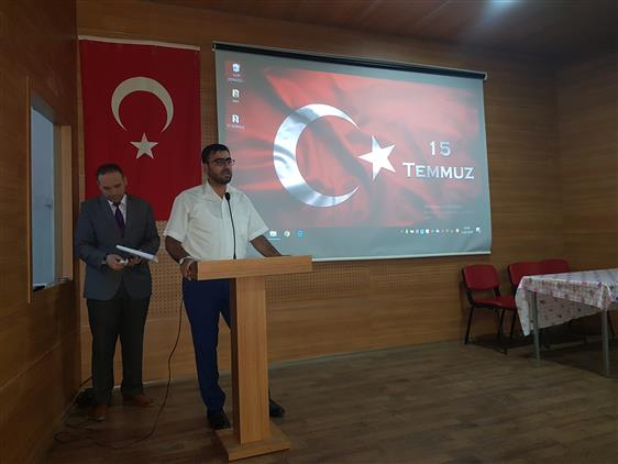 İlçe Kaymakamı, Garnizon Komutanı, Belediye Başkanı, kurum amirleri, Müftülük personeli, Kur’an Kursu öğreticileri, Yaz Kur’an Kursu öğrencileri ve velilerinin katıldığı anma programı Halk Eğitim Merkezi Müdür Yardımcısı Veysel ÇELİKER’in sunumu ve Taşbaşı Camii İmam Hatibi Emin KAVAK’ın sala okumasıyla başladı. Ardından Yaz Kur’an Kursu öğrencileri, Muhammed EREN, Arzu EROL ve Zeynep ECE tarafından Kur’an-ı Kerim tilavet edildi. Programda 15 Temmuz ile ilgili Diyanet İşleri Başkanlığı tarafından hazırlanan sinevizyon gösterisi izletildi.